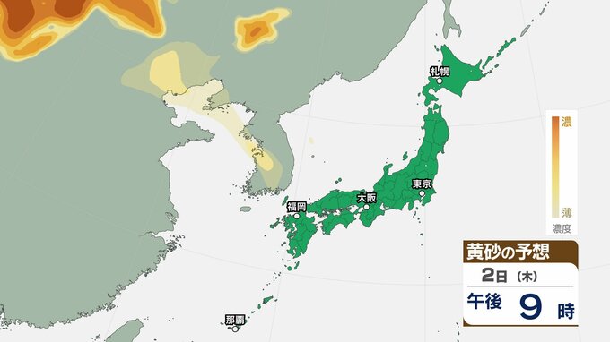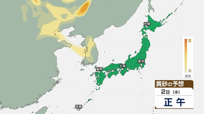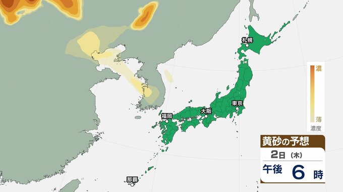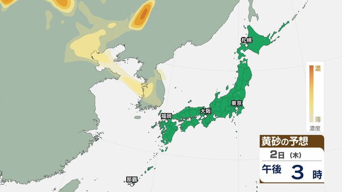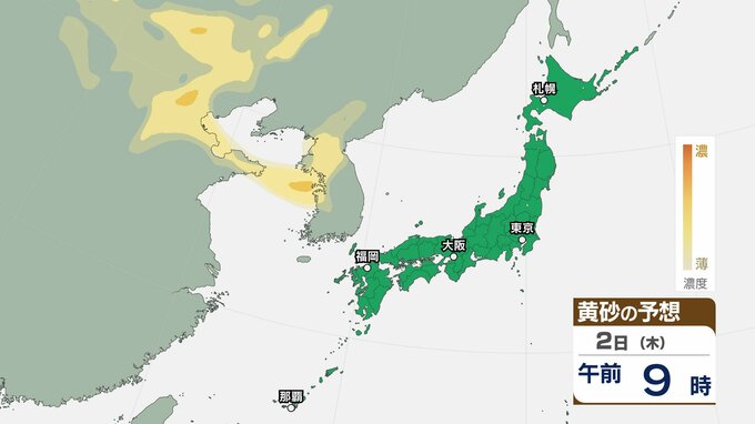 【黄砂情報】日本列島に黄砂が飛来か…5日(日)九州・中国・四国の広い範囲で影響の可能性【気象庁 黄砂シミュレーション/2日現在】 RSK山陽放送 2026年4月2日(木) 10:52 国内 天気 2日(木) ▶2日(木)~5日(日)黄砂シミュレーション画像 ▶2日(木)~5日(日)黄砂シミュレーション画像