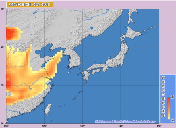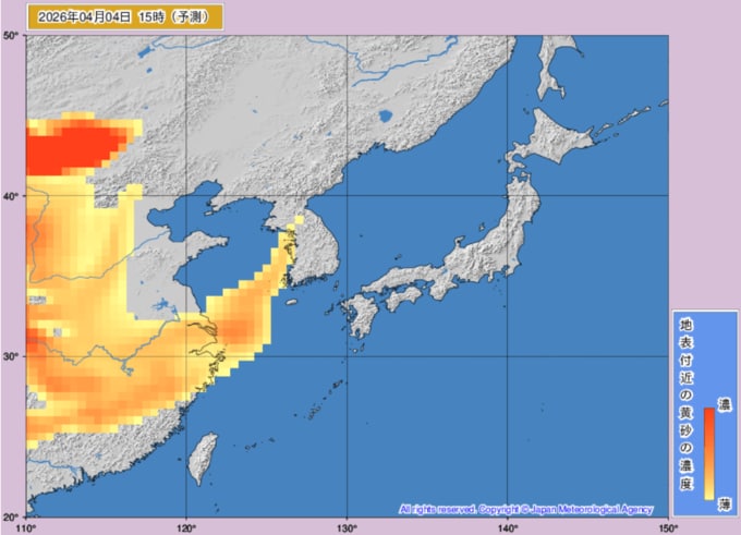 【黄砂情報】5日は日本列島に黄砂飛来か...4日~5日の黄砂シミュレーション いつどこに、どれくらい飛んでくる? 黄砂を上空から見たデータで確認 気象庁発表 全国の天気を画像で テレビユー山形 2026年4月2日(木) 12:00 国内 ■黄砂はいつどこに?(4日)
