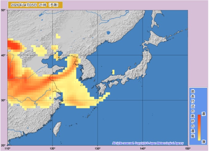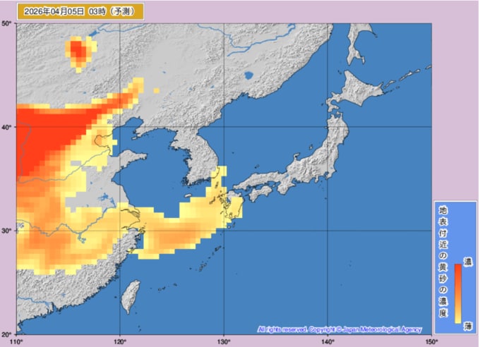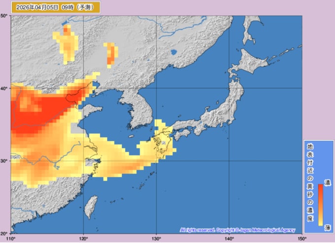 【黄砂情報】5日は日本列島に黄砂飛来か...4日~5日の黄砂シミュレーション いつどこに、どれくらい飛んでくる? 黄砂を上空から見たデータで確認 気象庁発表 全国の天気を画像で テレビユー山形 2026年4月2日(木) 12:00 国内 ■黄砂はいつどこに?(5日) ※画像は気象庁より
