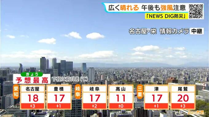 最高気温は名古屋で18℃、岐阜や津などで17℃、高山では11℃の予想です。日中は過ごしやすい陽気になる所も、夜は風の冷たさで空気がヒンヤリするでしょう。
