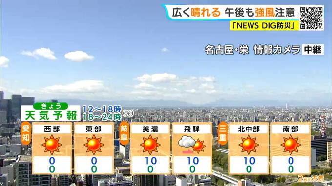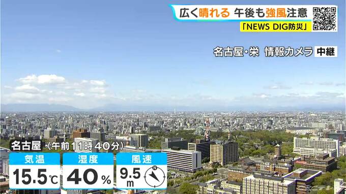 名古屋市内は、午前7時半ごろまでは雨が降っていましたが、正午前は青空が広がっています。気温は15.5℃で、風が強まっています。