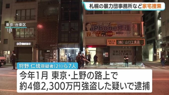 2026年1月、東京・上野の路上で現金4億円あまりが奪われた事件で、警視庁が2日、事件に関与したとみられる札幌の暴力団事務所などに家宅捜索に入りました。