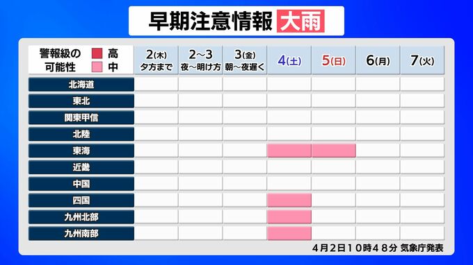 【警報級大雨のおそれ】東海地方 四国地方 九州地方