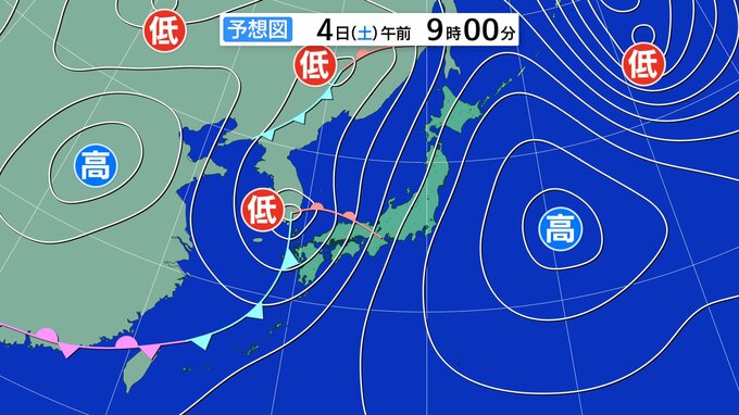 4日(土)には、低気圧が発達しながら日本海を進み、低気圧から延びる「寒冷前線」が列島を通過します。前線に向かって湿った南風が流れ込み、大雨のおそれだけでなく強風も伴うでしょう。