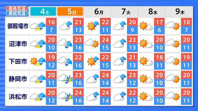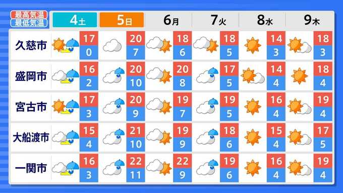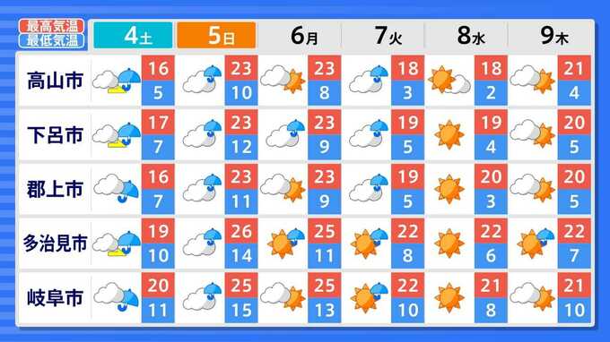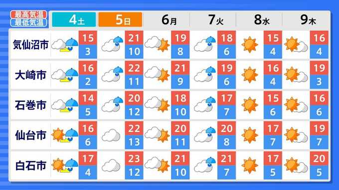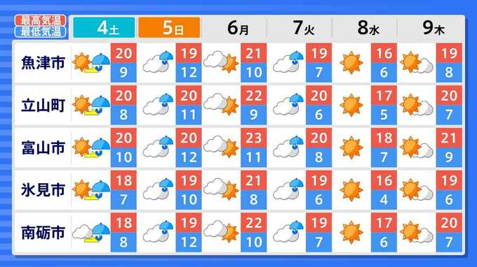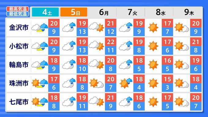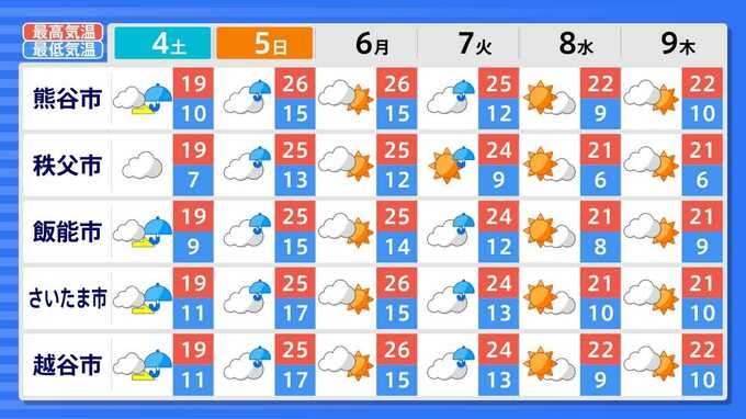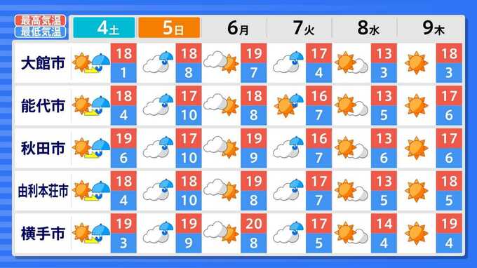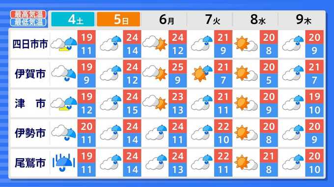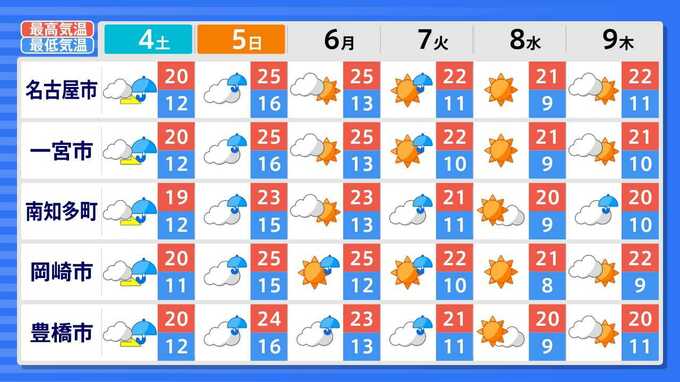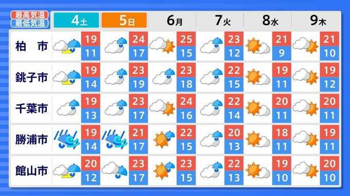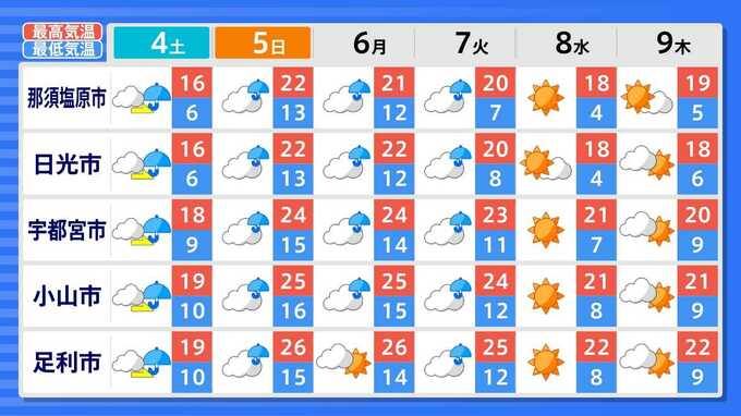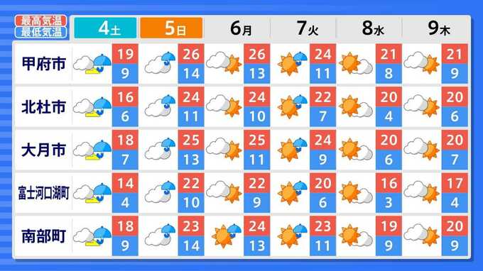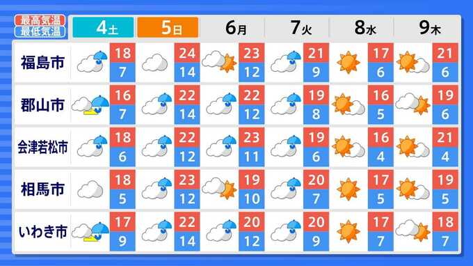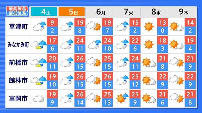 各都道府県の週間予報(9日(木)まで)を画像で掲載しています(各都道府県5か所ずつ)。