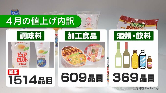 内訳を見てみますと最も多かったのは、マヨネーズやドレッシング類を中心とした調味料で1514品目。次に、即席麺やカップスープなどの加工食品で609品目、酒類・飲料が369品目となっています。