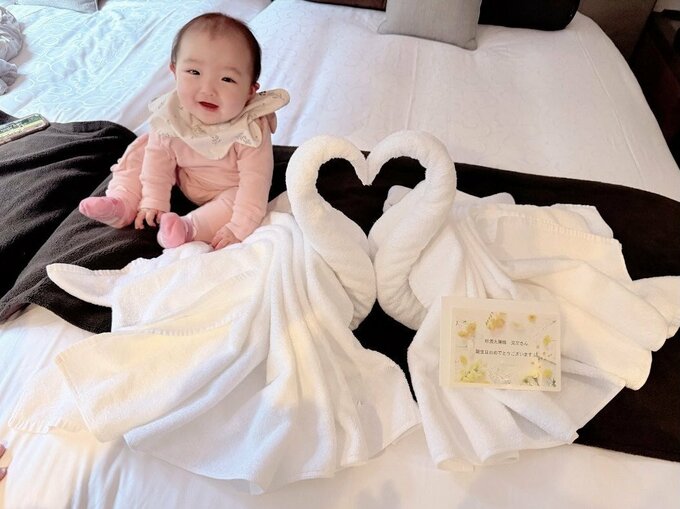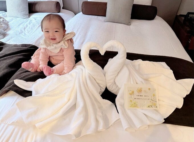 旅先では夢空ちゃんが「場所見知りしないかな⁈」と心配していた辻さんですが、ホテルのベッドの上でタオルアートに囲まれながらにこにこ笑顔を見せる夢空ちゃんの写真も投稿されており、初旅行を元気に楽しんでいる様子が伝わってきます。