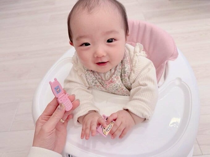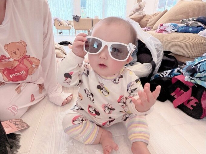投稿では、白いベビーチェアに座った夢空ちゃんがピンクの携帯電話のおもちゃなど興味津々な様子や、白いサングラスをかけようとするキュートな一コマなど、日常の微笑ましいシーンが収められています。