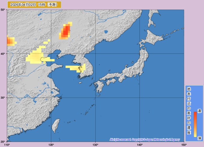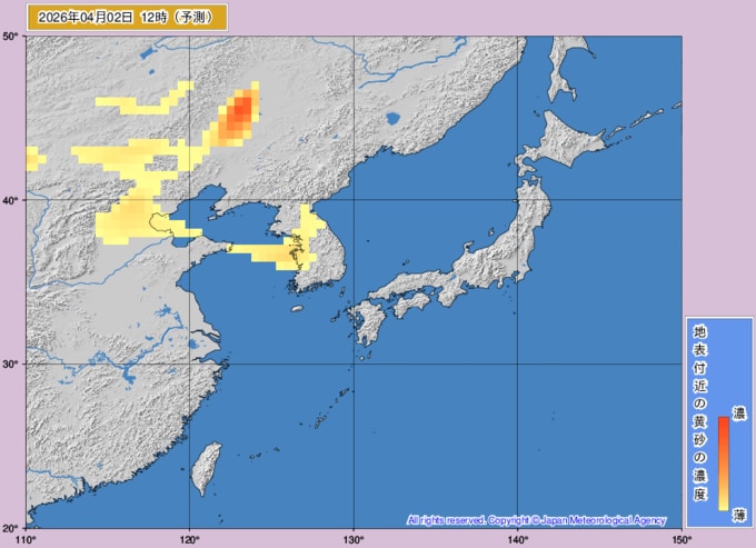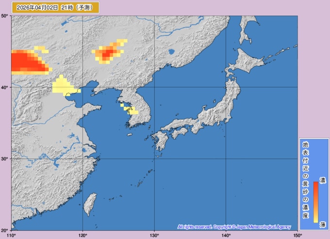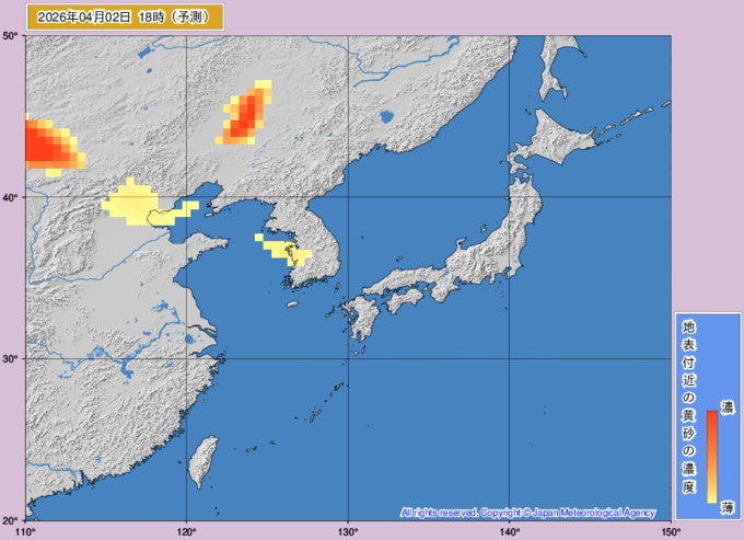 【黄砂情報】週末5日(日)に九州・中国・四国に黄砂飛来の可能性 西日本を“黄色い影”が覆うか… 濃度や飛来が予想されている時間帯は?【黄砂の最新予想シミュレーション・気象庁の黄砂解析予測図あり】 青森テレビ 2026年4月2日(木) 14:35 国内 【4月2日(木)】気象庁の黄砂情報「黄砂解析予測図」 ※画像は気象庁HPより ♦黄砂解析予測図 ♦黄砂の予想シミュレーション(4月2日・3日・4日・5日) ♦記事を最初から読む