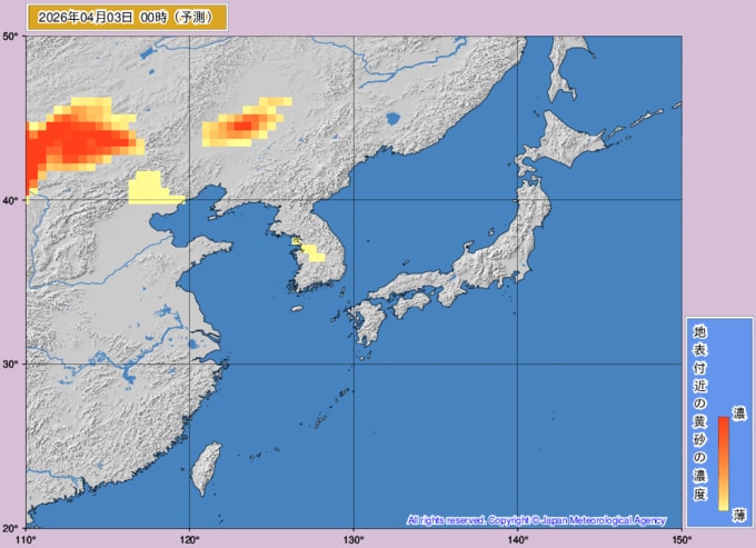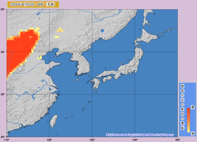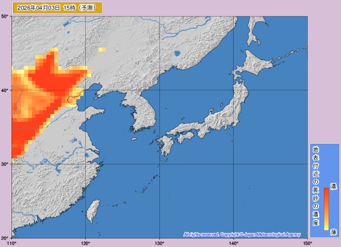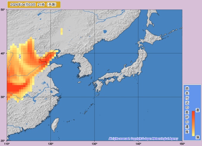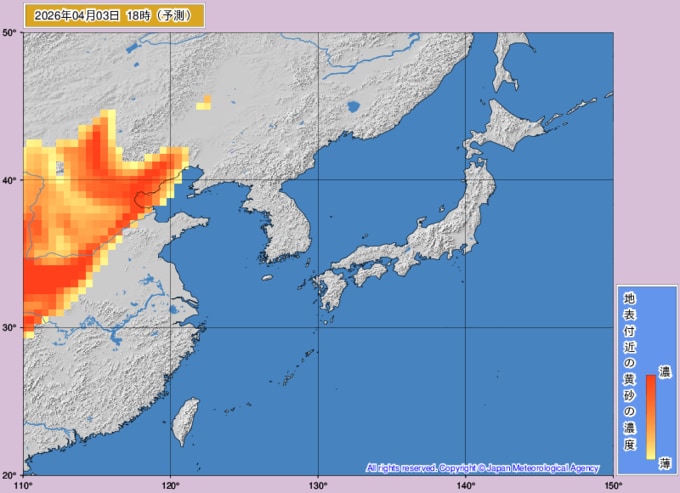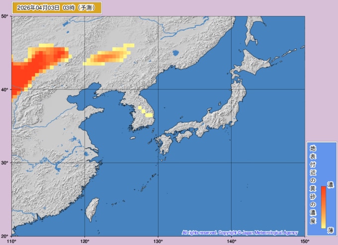 【黄砂情報】週末5日(日)に九州・中国・四国に黄砂飛来の可能性 西日本を“黄色い影”が覆うか… 濃度や飛来が予想されている時間帯は?【黄砂の最新予想シミュレーション・気象庁の黄砂解析予測図あり】 青森テレビ 2026年4月2日(木) 14:35 国内 【4月3日(金)】気象庁の黄砂情報「黄砂解析予測図」 ※画像は気象庁HPより ♦黄砂解析予測図 ♦黄砂の予想シミュレーション(4月2日・3日・4日・5日) ♦記事を最初から読む
