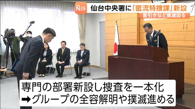 仙台中央警察署に新設されたのは「匿名・流動型犯罪グループ特別捜査課」で、4月2日は、着任した捜査員らが開設式を行いました。トクリュウはSNSなどで実行役を募り強盗や特殊詐欺などをする犯罪組織です。仙台中央署管内の国分町では2025年、トクリュウによるとみられる違法な客引き行為や風俗店へのスカウトなどが摘発されていますが、こうした違法行為が後を絶たないということです。専門の部署を新設することで、これまで刑事第二課や生活安全課などが担ってきた捜査を一本化しグループの全容解明や撲滅を進める狙いです。