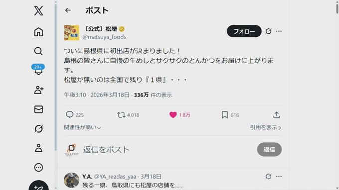 松屋の公式Xがつぶやく最後の1県こそが、「鳥取県」。