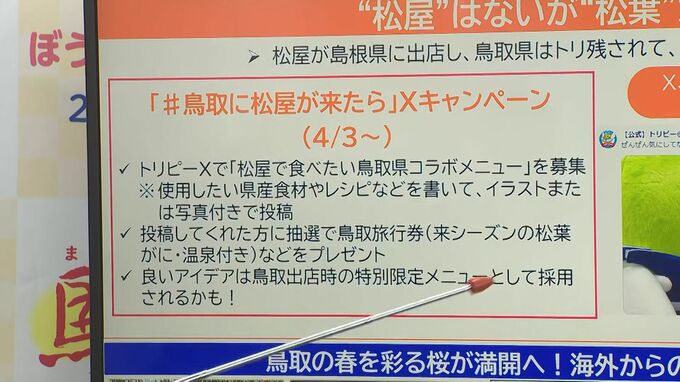 投稿した人の中から抽選で鳥取への旅行券が当たるほか、松屋が鳥取に出店した際には特別限定メニューとして採用されるかもしれないということです。