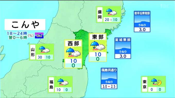 16時現在、雨が降っている所も次第に止み、晴れ間が戻るでしょう。海上の波はうねりを伴い高いため、午後9時頃まで高波に注意が必要です。