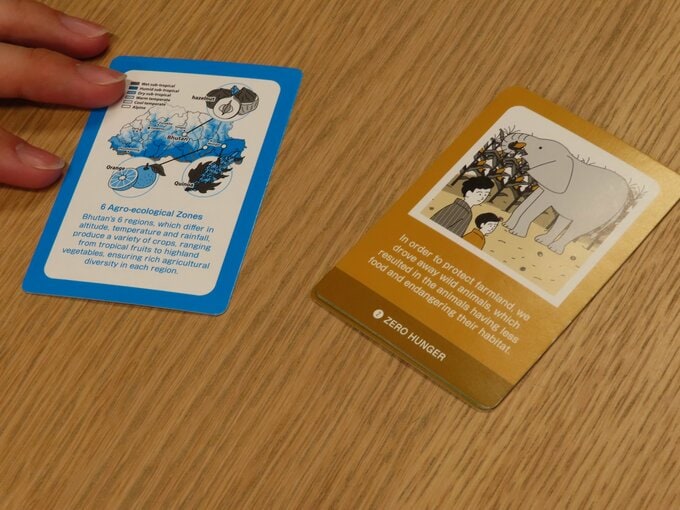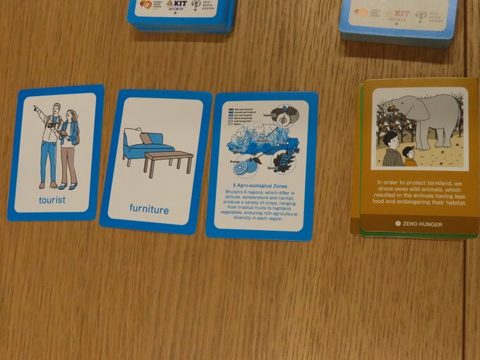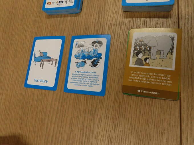 トレードオフカードの山から出た「課題」は、象などの野生動物が畑を荒らすのを防ぎたいが、ブータンには野生動物を大切にする伝統文化がある。どうすれば畑に来る野生動物を傷つけずに農業ができるかというブータンならではのトレードオフだ。