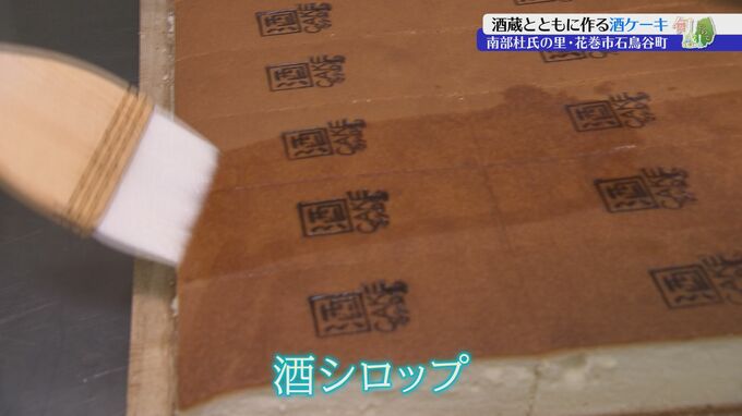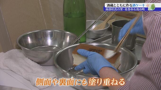 ハケで一つ一つ丁寧に塗っているのは地元・石鳥谷町の川村酒造店が仕込んだ日本酒「南部関」と、陸前高田市に本社を構える酒蔵「酔仙」が酒ケーキのために用意した高濃度の焼酎、そしてこの2つに水や砂糖を加えた酒シロップです。