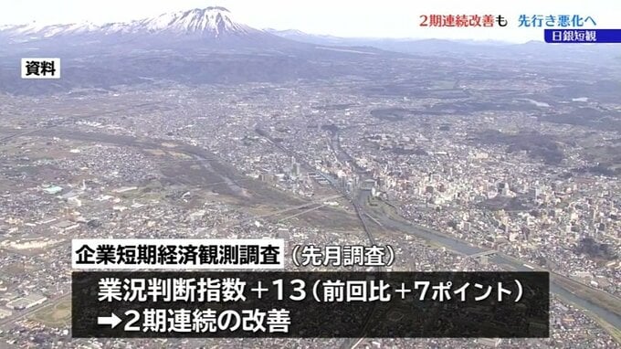 日本銀行盛岡事務所によりますと「景気がいい」と答えた企業の比率から「悪い」と答えた企業の比率を引いた「業況判断指数」は、全産業でプラス13と前回12月の調査から7ポイント上がり、2期連続の改善となりました。
