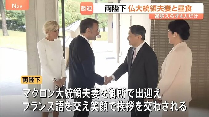 きょう正午ごろ、両陛下はマクロン大統領夫妻をお住まいの御所で出迎え、フランス語を交えながら笑顔で挨拶を交わされました。