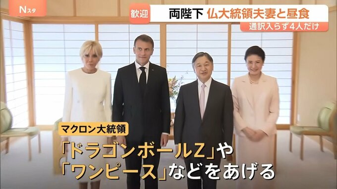 天皇皇后両陛下 マクロン大統領夫妻と昼食会 通訳入らず4人だけで1時間半 面会は7年ぶり TBSテレビ 2026年4月2日(木) 16:54 国内 マクロン大統領は「ドラゴンボールZ」や「ワンピース」などを その後、フランスで有名なアニメや漫画の話題におよび、陛下が「どういうのが人気ですか」と尋ねると、マクロン大統領は「ドラゴンボールZ」や「ワンピース」などをあげたということです。