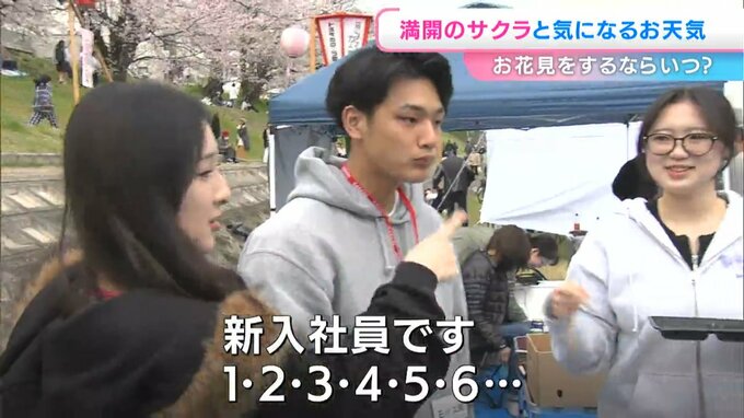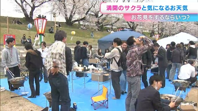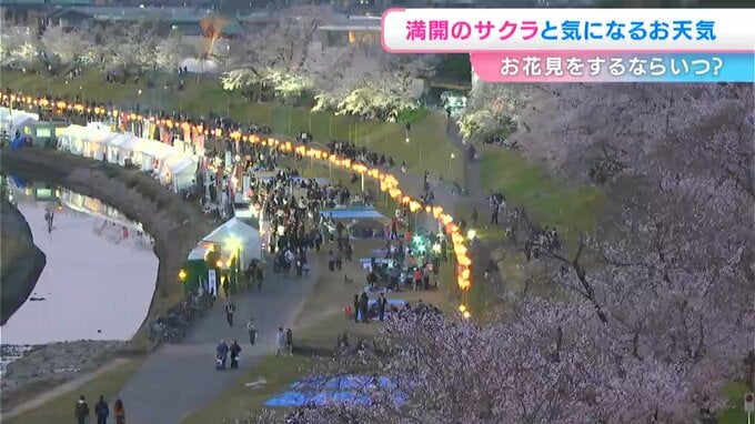 日中の様子をご覧いただきましたが、日が落ちても多くの花見客で賑わっている「さくらカーニバル」の会場です。“春時雨”の言葉通り、サクラの開花後、ぐずつく日が続いています。週末にかけてお花見をするならいつがいいのか、気になる天気を確認しましょう。