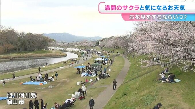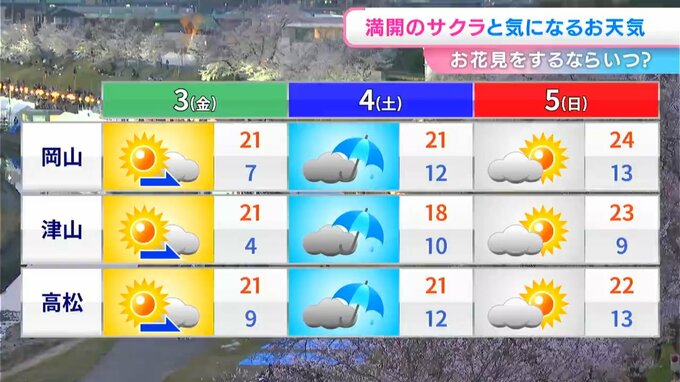 あす3日金曜日は、日差しが届く天気になりそうです。気温も暑すぎず、ちょうどいいでしょう。4日土曜日は、日中を中心に雨が降り、お花見には適さない天候となりそうです。そして5日日曜日は、雨があがって雲が広がりやすい見込みです。最もきれいにお花見が楽しめるのは、あす3日の金曜日となりそうです。