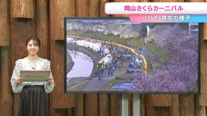 ご覧いただいているのは旭川河川敷で開かれている「岡山さくらカーニバル」の現在の様子ですが、平日のきょう(2日)も花見客でにぎわっています。