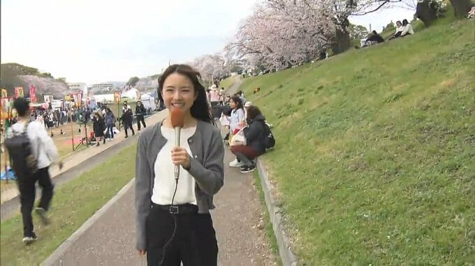 「桜が満開の旭川河川敷にある岡山さくらカーニバルの会場に来ています。ご覧の通り、平日にもかかわらず、多くの人が花見を楽しんでいます」