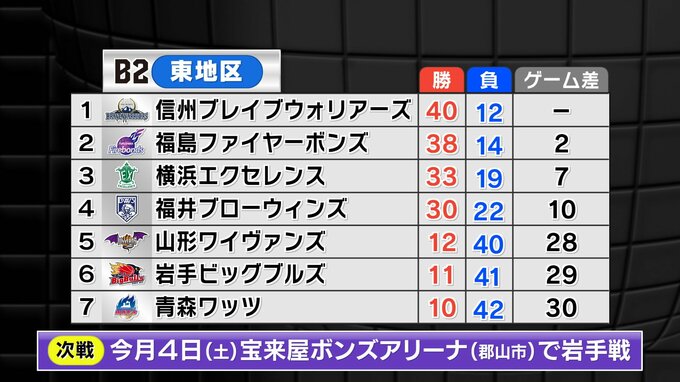 B2東地区首位の信州が勝ったため、ボンズとのゲーム差は2のままです。次の試合は4日、ホームで6位の岩手と対戦します。