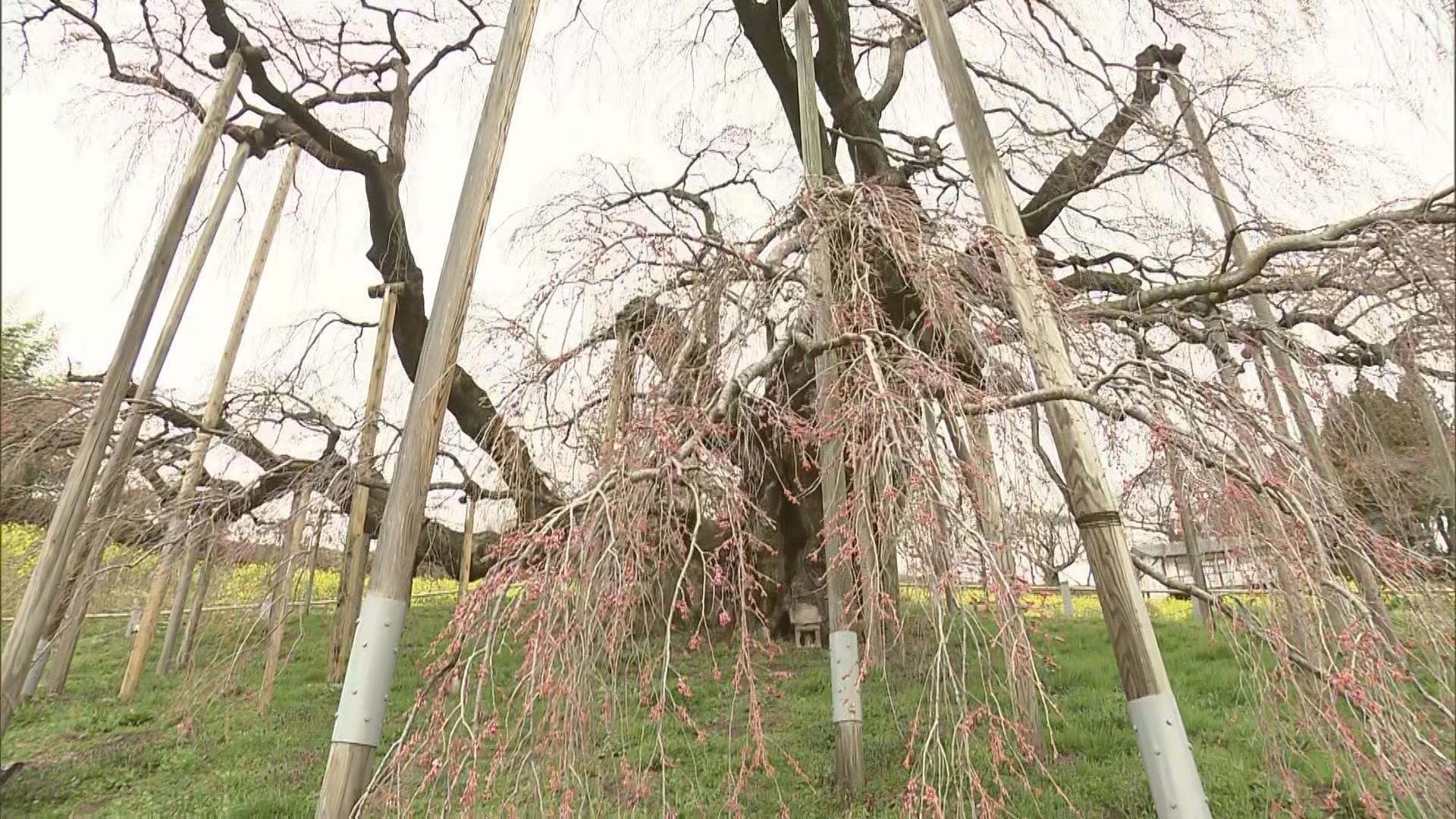国の天然記念物に指定され、樹齢1000年を超えるこの滝桜。流れ落ちる滝のように咲く様子が毎年多くの人を魅了しています。3月には雪の影響で枝が折れる被害がありましたが、開花には影響はないということです。