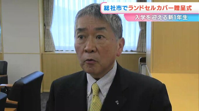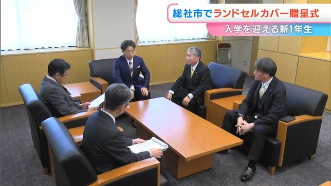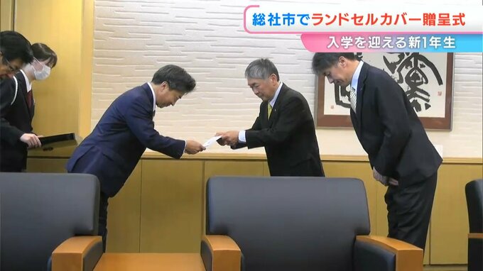 贈呈式では、学生衣料販売の「ながたや」と教育用シューズ卸売りの「ジェス西日本」からランドセルカバー750枚の目録が、片岡聡一総社市長に贈られました。