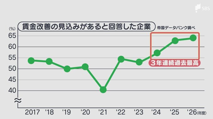 帝国データバンクによりますと、2026年度、賃金の改善を見込んでいる県内企業は64.3%。3年連続で前の年を上回り、過去最高を更新しました。