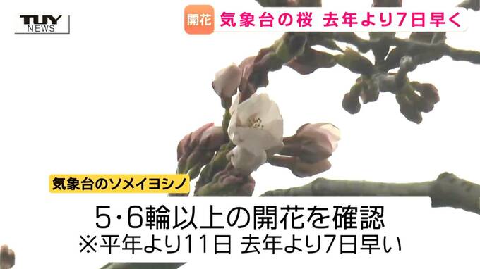 気象台によりますと、敷地内にある標本木のソメイヨシノに5輪から6輪以上の花が咲いているのが確認されたということです。平年より11日早く、去年より7日早い開花です。