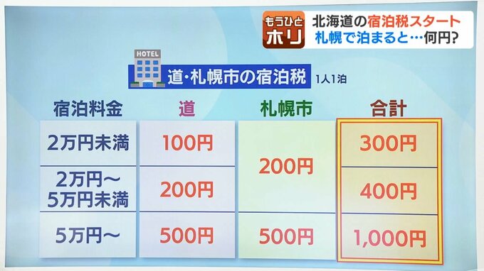 【4月1日開始】北海道各地で”宿泊税”スタート 道民も対象でインフラ整備に期待も「痛い出費」と戸惑う声…物価高のなか家族旅行に痛手 観光地の課題解決なるか 北海道放送 2026年4月2日(木) 19:50 国内 新たな宿泊税の仕組み 北海道の宿泊税は1人1泊2万円未満で100円、2万円以上5万円未満で200円、5万円以上で500円です。 さらに、札幌市に宿泊した場合は、1泊5万円未満は200円、5万円以上で500円が追加されます。