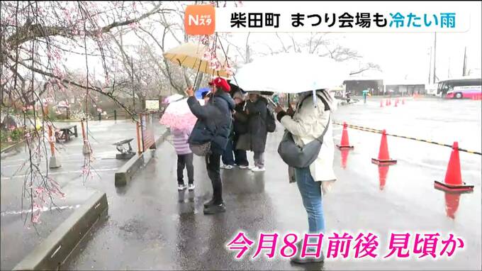 宮城県柴田町の「船岡城址公園」では4月1日から「桜まつり」が始まりましたがこちらも午前中、冷たい雨が降っていました。それでも台湾からのツアー客がソメイヨシノやシダレザクラなどを背景に写真撮影を楽しんでいました。