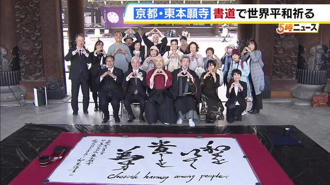 中東情勢が緊迫化するなか、京都では書道家らが参加して世界平和を願うイベントが行われました。 真剣なまなざしで筆を運ぶ書道家。 平和への思いを込めて、日本語と英語で書き上げたのは「和を以て貴しと為す」…