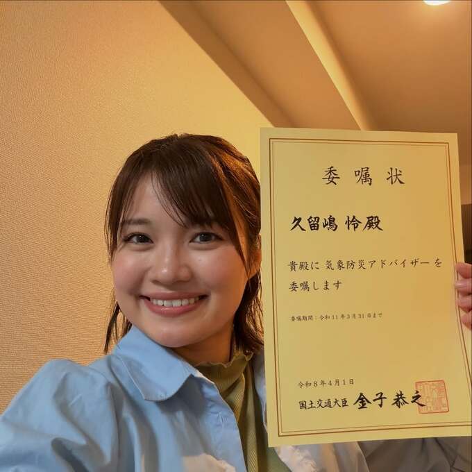 気象予報士の久留嶋怜さんが自身のインスタグラムを更新。『気象防災アドバイザー』として委嘱を受けたことを報告しました。