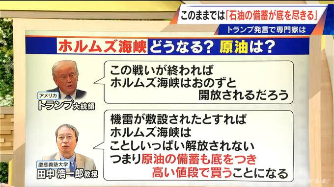 しかし、慶應義塾大学の田中浩一郎教授は「機雷が敷設されたとすれば、ホルムズ海峡は今年いっぱい開放されない。つまり、原油の備蓄も底をつき、他の国の高い原油を高い値段で買うことになる」と話していました。