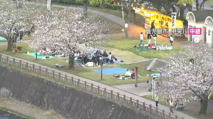 甲突川河畔もブルーシートがたくさん並んでいます。結構満開に近いところが増えてきました。
