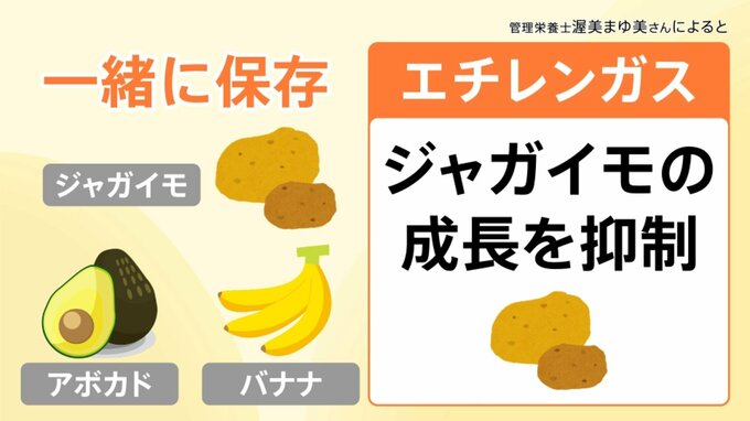成長する過程で発生する「ソラニン」。渥美さんによると、ジャガイモの保存には、成長を抑制するエチレンガスが効果的で、それらを含むアボカドやバナナと一緒にジャガイモを保存すると長持ちするということです。