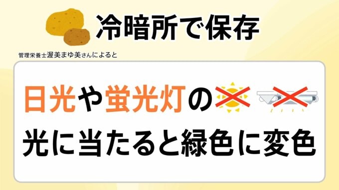 管理栄養士の渥美まゆ美さんによると、ジャガイモは日光や照明などの光に当たると光合成が進み、緑色に変色します。その部分には有毒成分である「ソラニン」が多く含まれているということです。