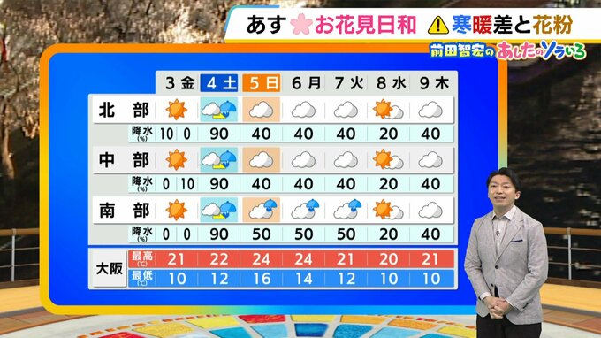 4月3日(金)の近畿地方は、晴れて絶好のお花見日和になりそうです。南から高気圧にしっかりと覆われて、各地で穏やかに晴れるでしょう。夜は雲が増えてきますが、天気の崩れは1日なさそうです。 朝の最低気温は…
