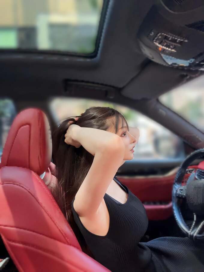 神子島さんは、左ハンドルの赤いシートの車内で寛ぐ様子の写真を複数投稿。イージーな印象の黒のノースリーブドレスで、季節は初夏から夏の間と思われる光景です。
