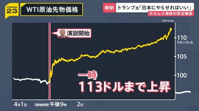 トランプ氏の期待とは裏腹に、演説開始からニューヨークの原油市場では原油価格が急騰。WTI原油先物価格は一時、1バレル=110ドルを超えました。