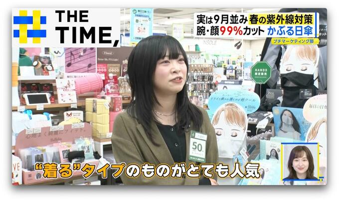 2月中旬から紫外線対策コーナーを展開している『ハンズ渋谷』(東京・渋谷区)では、“着るタイプ”の対策グッズが注目されているとのこと。「最近は“洗濯をしてもUVカット率が落ちない”というものが多いので」(ハンズ広報部・玉野早紀さん)