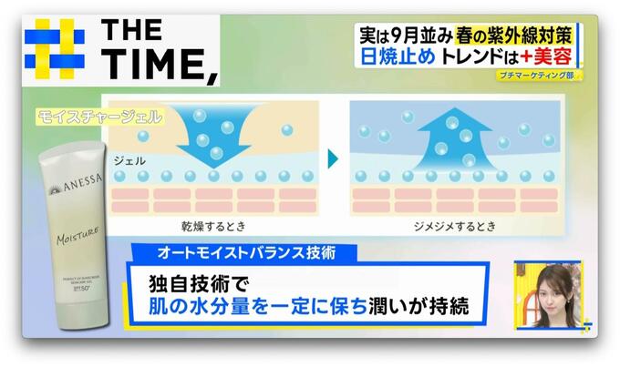 2月に発売された「アネッサ パーフェクトUV スキンケアジェル NB」(資生堂/90g・2508円)は、従来のUVケアに加え、独自技術で“肌の水分量を一定に保ち”潤いが持続する効果のある日焼け止め。