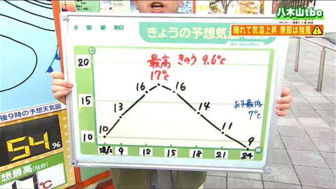 【3日宮城の天気】晴れて気温上昇・仙台で最高気温17℃【花粉・サクラ開花状況掲載】夕方まで強風に注意 tbc気象台 東北放送 2026年4月3日(金) 11:30 国内 天気 本日4月3日(金)の宮城県内は、高気圧に覆われて広い範囲で晴れとなっています。 最高気温は仙台で17℃と昨日より8℃も高く、4月中旬から下旬並みの陽気となりそうです。一方で、西寄りの強風に夕方まで注意が必要です。