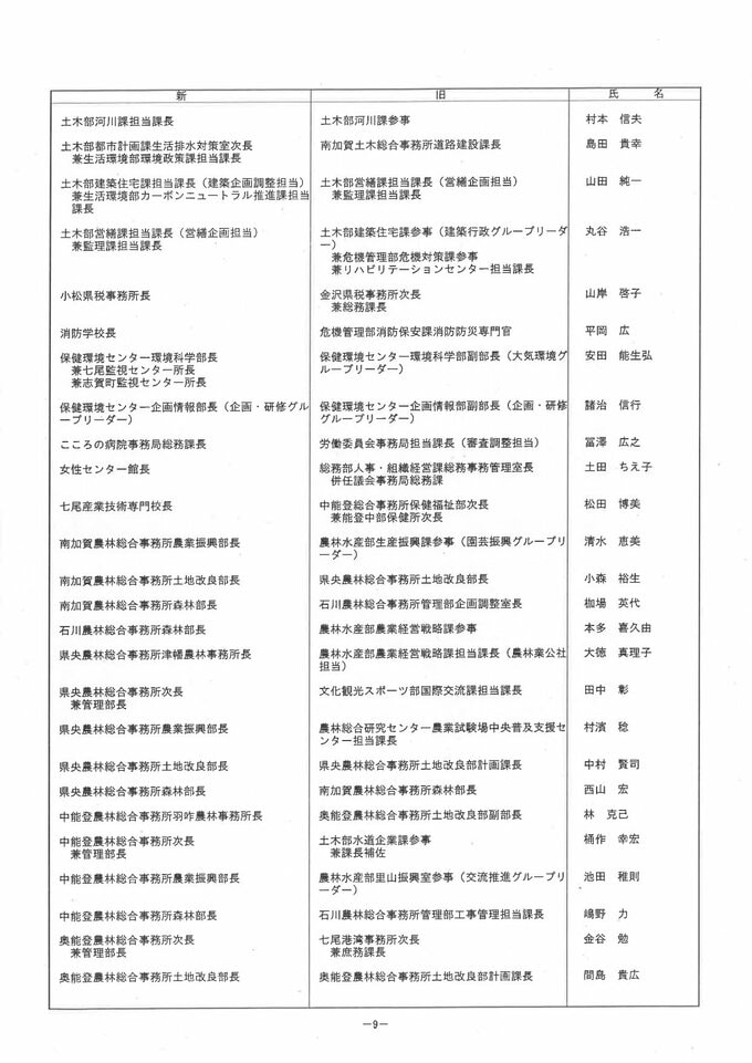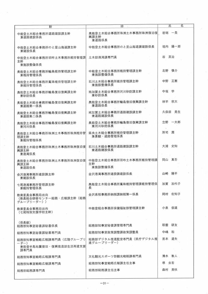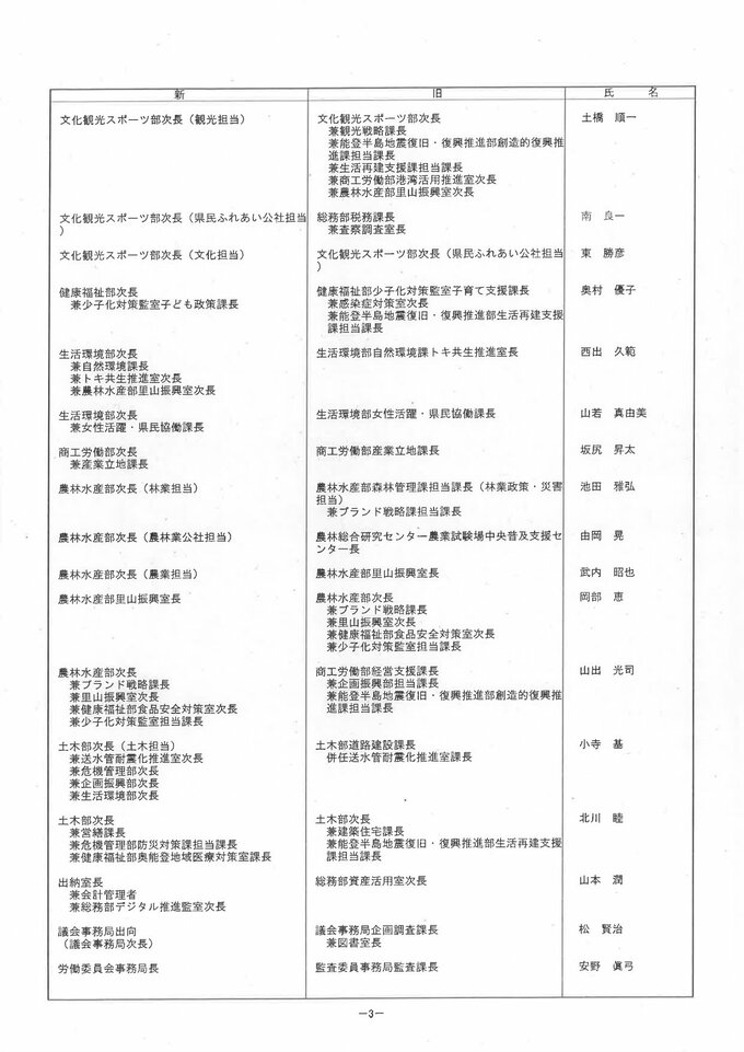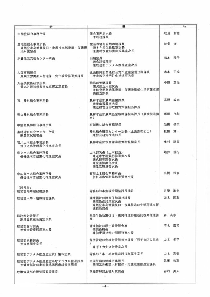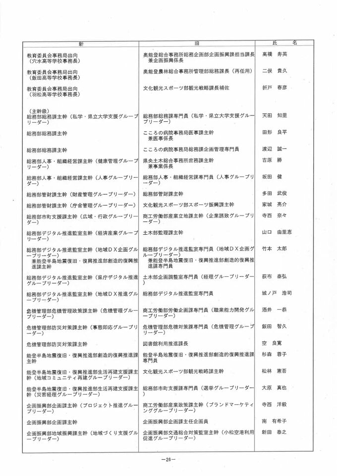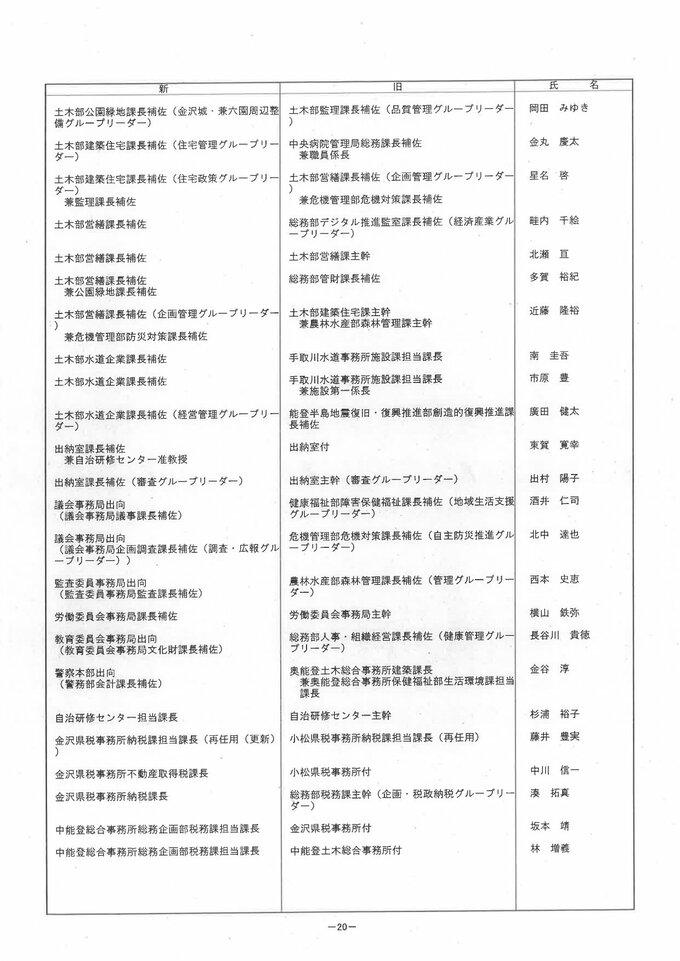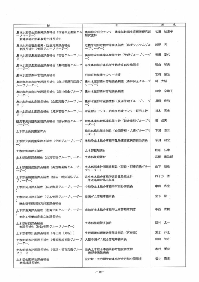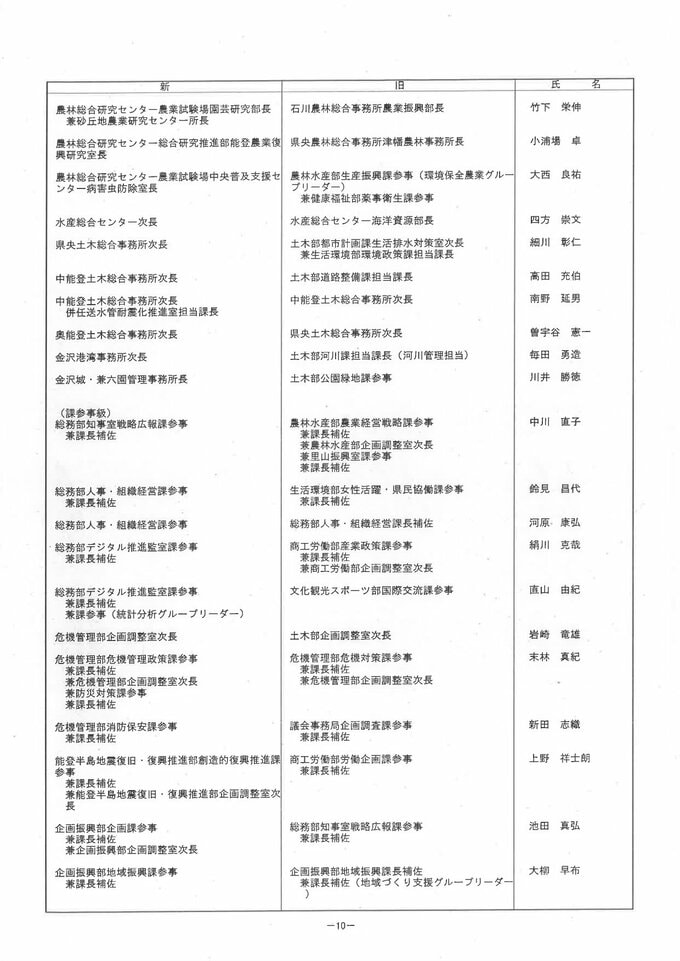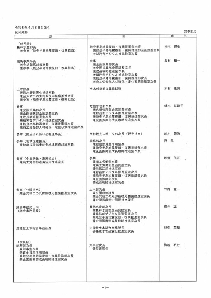 石川県職員・人事異動【2026年4月8日付け】若手や女性を積極登用・地元部長級女性は過去最多3人 北陸放送 2026年4月3日(金) 11:54 国内 【知事部局・役付異動】部長級・次長級・課長級・担当課長級・課参事級・課長補佐級・主幹級・係長級 石川県発表の人事異動より 石川県発表の人事異動より 石川県発表の人事異動より 石川県発表の人事異動より 石川県発表の人事異動より 石川県発表の人事異動より 石川県発表の人事異動より 石川県発表の人事異動より 石川県発表の人事異動より 石川県発表の人事異動より 石川県発表の人事異動より 石川県発表の人事異動より 石川県発表の人事異動より 石川県発表の人事異動より 石川県発表の人事異動より 石川県発表の人事異動より 石川県発表の人事異動より 石川県発表の人事異動より 石川県発表の人事異動より 石川県発表の人事異動より 石川県発表の人事異動より 石川県発表の人事異動より 石川県発表の人事異動より 石川県発表の人事異動より 石川県発表の人事異動より 石川県発表の人事異動より 石川県発表の人事異動より 石川県発表の人事異動より 石川県発表の人事異動より 石川県発表の人事異動より 石川県発表の人事異動より 石川県発表の人事異動より 石川県発表の人事異動より 石川県発表の人事異動より 石川県発表の人事異動より 石川県発表の人事異動より 石川県発表の人事異動より 石川県発表の人事異動より 石川県発表の人事異動より 石川県発表の人事異動より 石川県発表の人事異動より