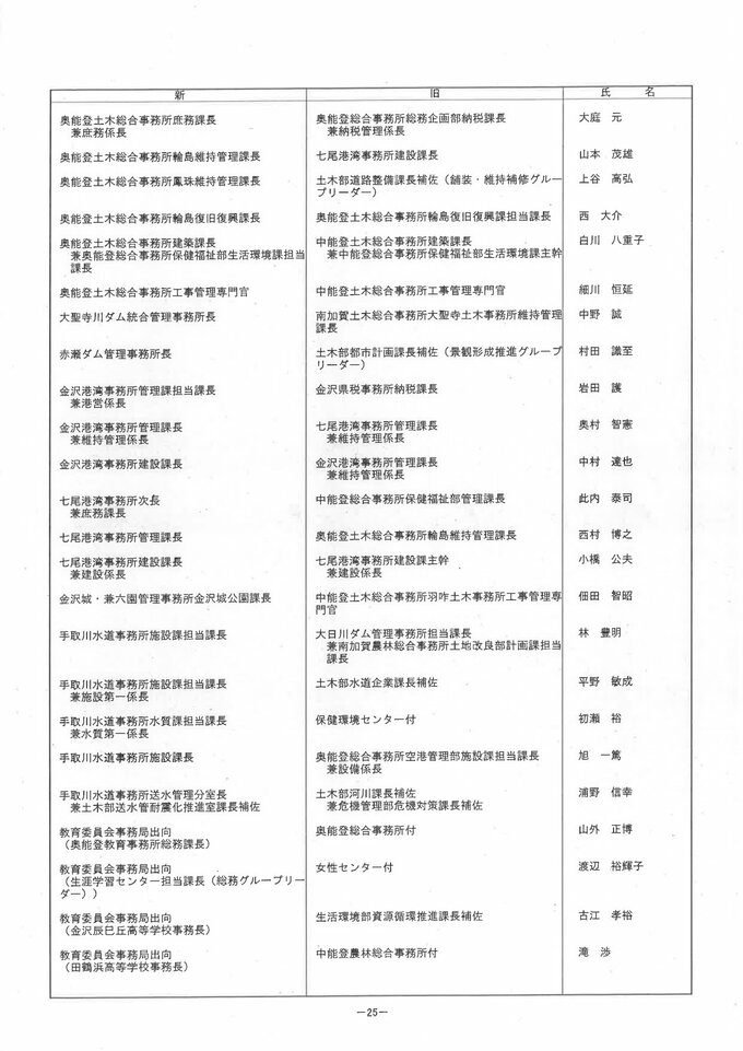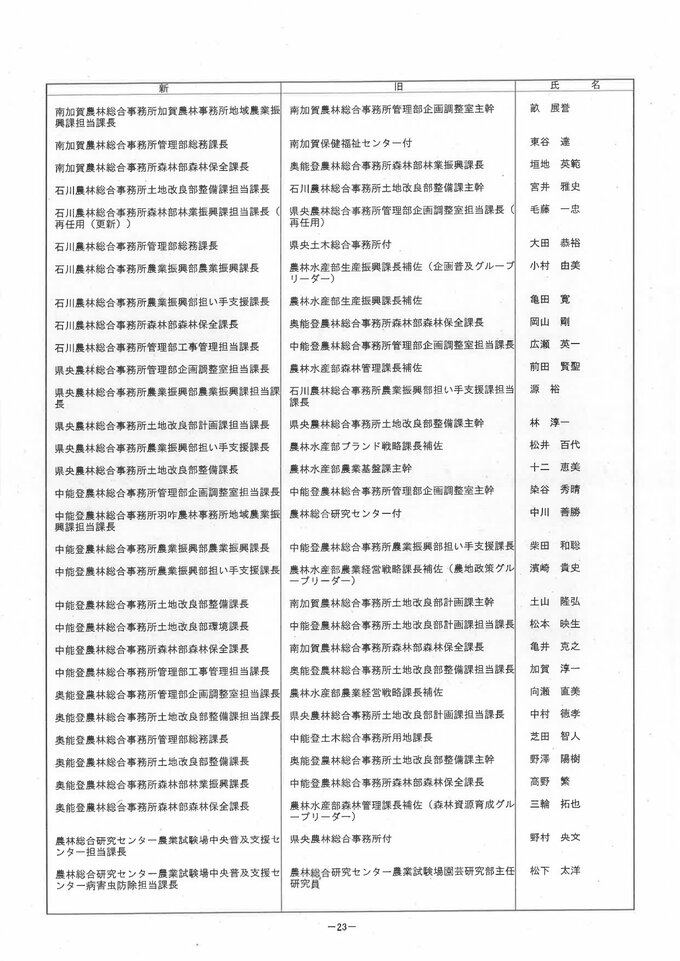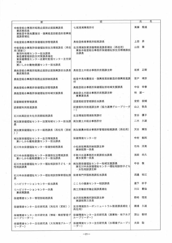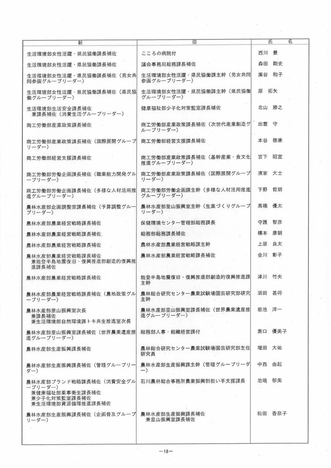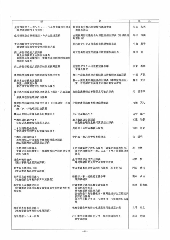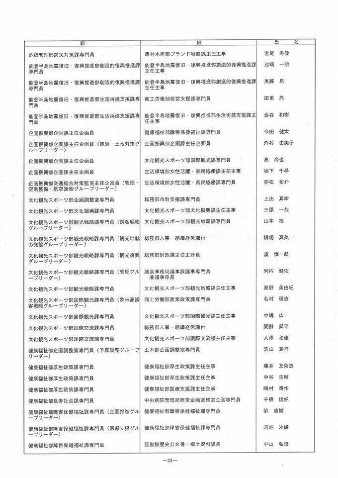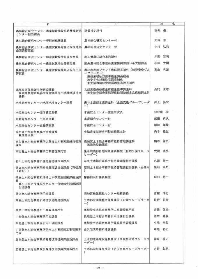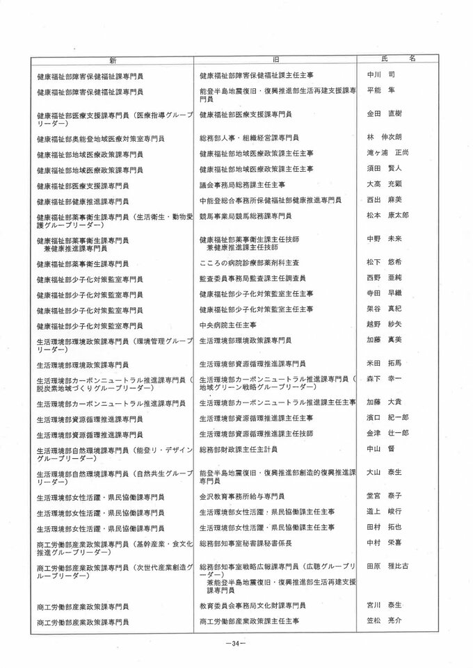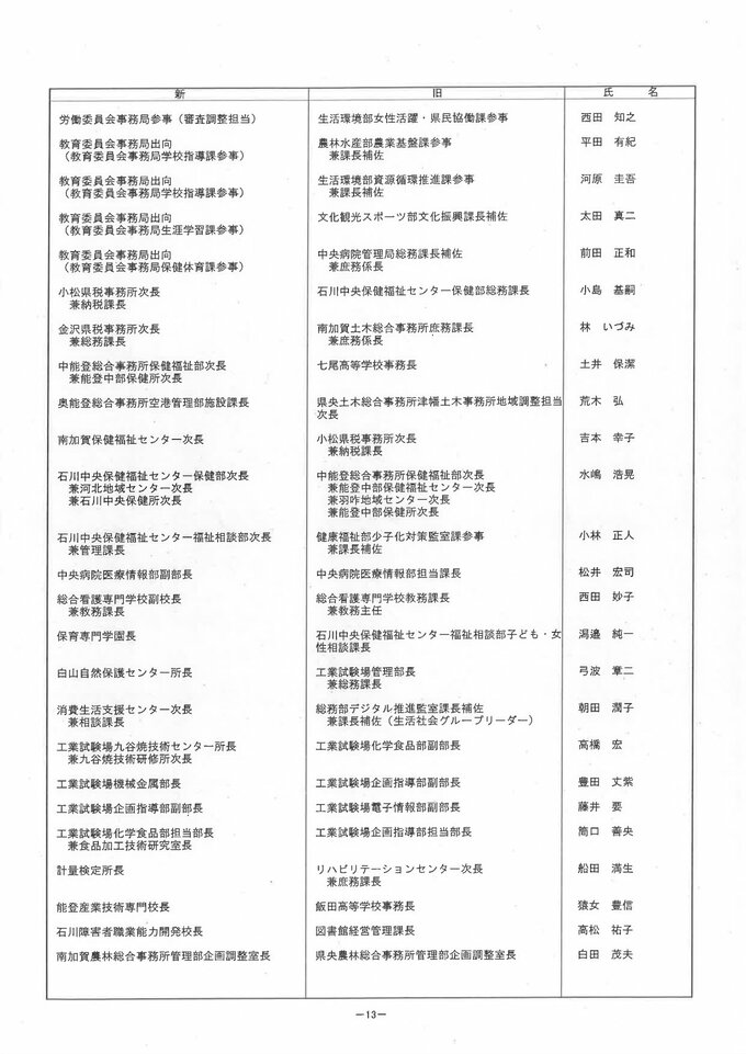 石川県職員・人事異動【2026年4月8日付け】若手や女性を積極登用・地元部長級女性は過去最多3人 北陸放送 2026年4月3日(金) 11:54 国内 【知事部局・役付異動】部長級・次長級・課長級・担当課長級・課参事級・課長補佐級・主幹級・係長級 石川県発表の人事異動より 石川県発表の人事異動より 石川県発表の人事異動より 石川県発表の人事異動より 石川県発表の人事異動より 石川県発表の人事異動より 石川県発表の人事異動より 石川県発表の人事異動より 石川県発表の人事異動より 石川県発表の人事異動より 石川県発表の人事異動より 石川県発表の人事異動より 石川県発表の人事異動より 石川県発表の人事異動より 石川県発表の人事異動より 石川県発表の人事異動より 石川県発表の人事異動より 石川県発表の人事異動より 石川県発表の人事異動より 石川県発表の人事異動より 石川県発表の人事異動より 石川県発表の人事異動より 石川県発表の人事異動より 石川県発表の人事異動より 石川県発表の人事異動より 石川県発表の人事異動より 石川県発表の人事異動より 石川県発表の人事異動より 石川県発表の人事異動より 石川県発表の人事異動より 石川県発表の人事異動より 石川県発表の人事異動より 石川県発表の人事異動より 石川県発表の人事異動より 石川県発表の人事異動より 石川県発表の人事異動より 石川県発表の人事異動より 石川県発表の人事異動より 石川県発表の人事異動より 石川県発表の人事異動より 石川県発表の人事異動より
