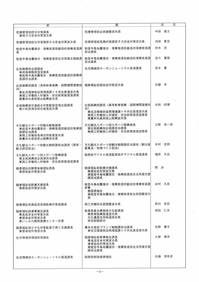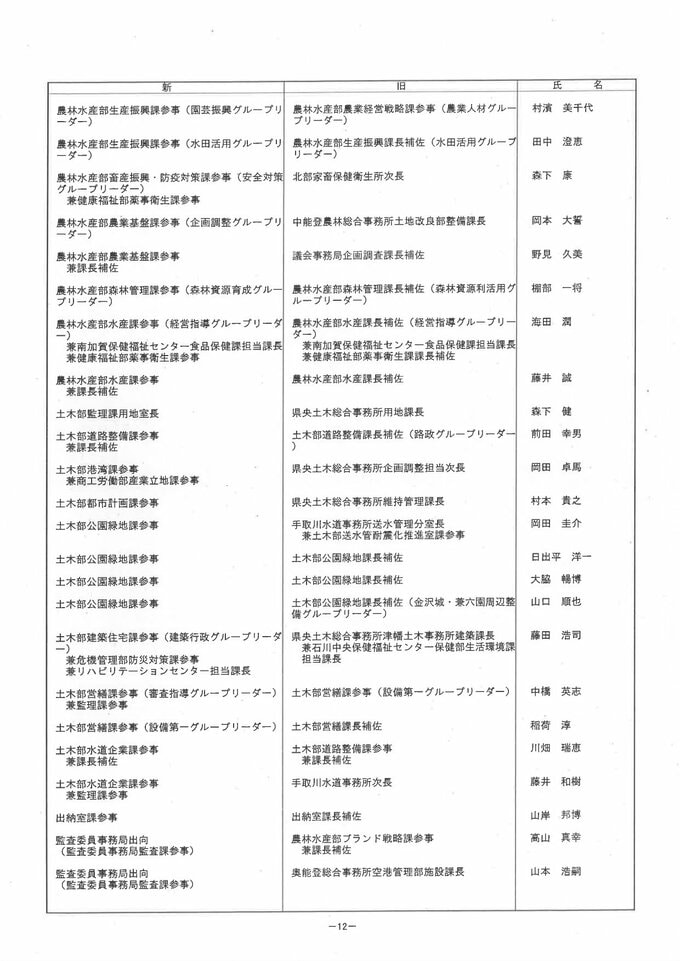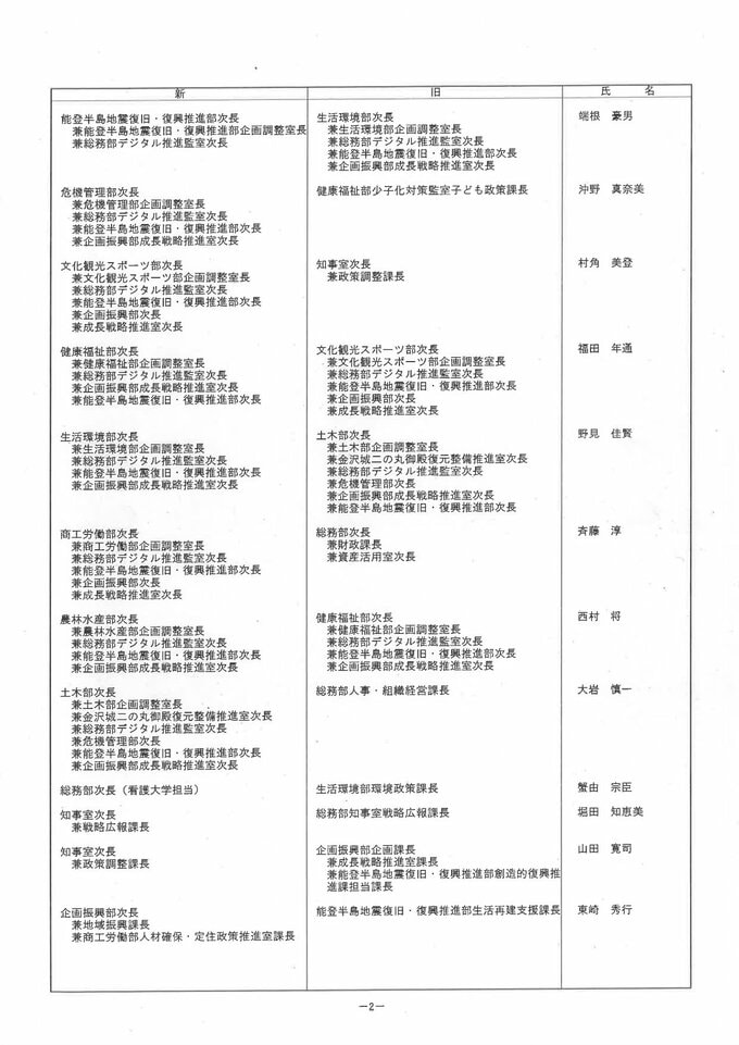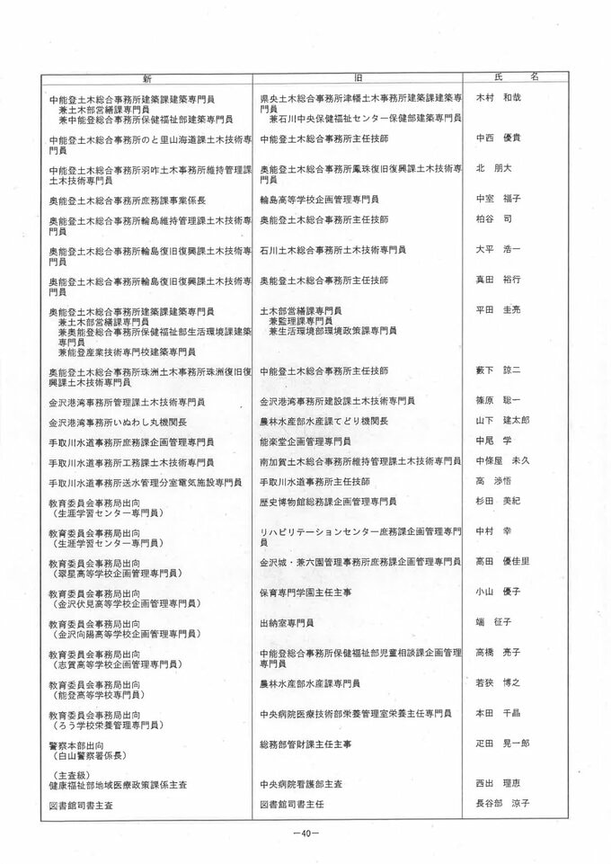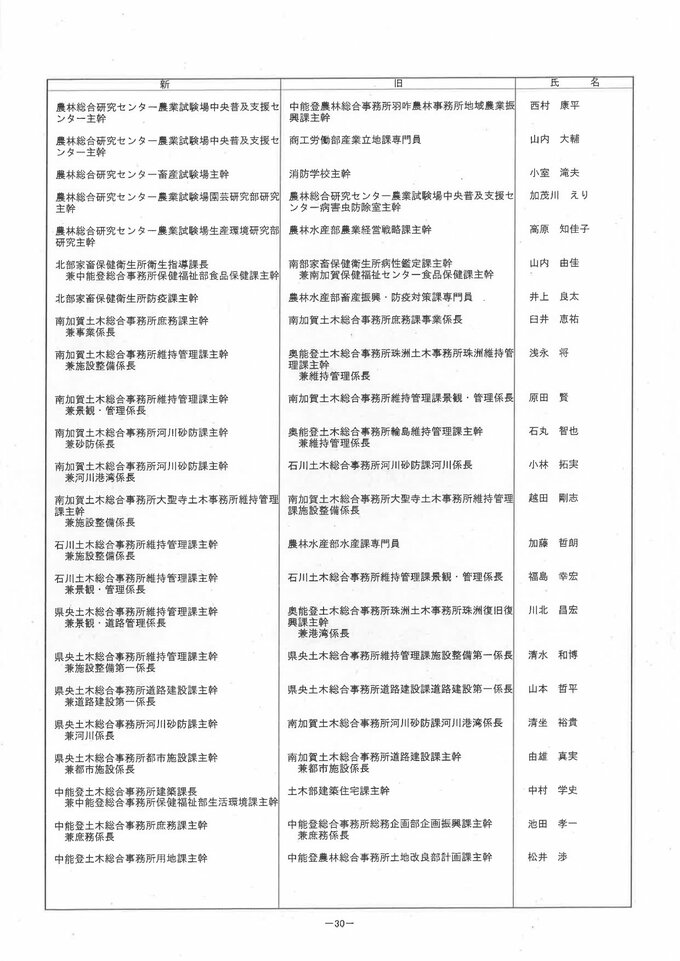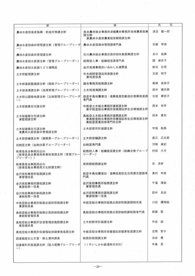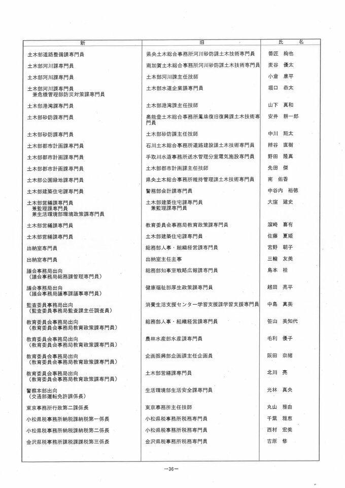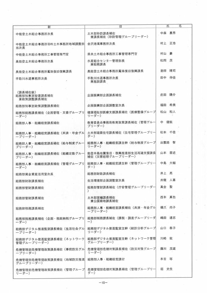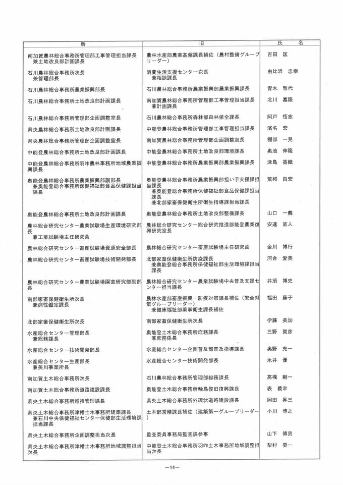 石川県職員・人事異動【2026年4月8日付け】若手や女性を積極登用・地元部長級女性は過去最多3人 北陸放送 2026年4月3日(金) 11:54 国内 【知事部局・役付異動】部長級・次長級・課長級・担当課長級・課参事級・課長補佐級・主幹級・係長級 石川県発表の人事異動より 石川県発表の人事異動より 石川県発表の人事異動より 石川県発表の人事異動より 石川県発表の人事異動より 石川県発表の人事異動より 石川県発表の人事異動より 石川県発表の人事異動より 石川県発表の人事異動より 石川県発表の人事異動より 石川県発表の人事異動より 石川県発表の人事異動より 石川県発表の人事異動より 石川県発表の人事異動より 石川県発表の人事異動より 石川県発表の人事異動より 石川県発表の人事異動より 石川県発表の人事異動より 石川県発表の人事異動より 石川県発表の人事異動より 石川県発表の人事異動より 石川県発表の人事異動より 石川県発表の人事異動より 石川県発表の人事異動より 石川県発表の人事異動より 石川県発表の人事異動より 石川県発表の人事異動より 石川県発表の人事異動より 石川県発表の人事異動より 石川県発表の人事異動より 石川県発表の人事異動より 石川県発表の人事異動より 石川県発表の人事異動より 石川県発表の人事異動より 石川県発表の人事異動より 石川県発表の人事異動より 石川県発表の人事異動より 石川県発表の人事異動より 石川県発表の人事異動より 石川県発表の人事異動より 石川県発表の人事異動より