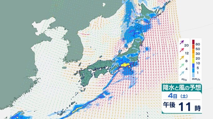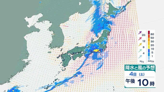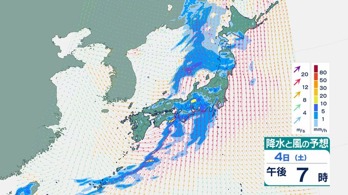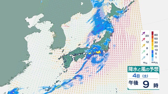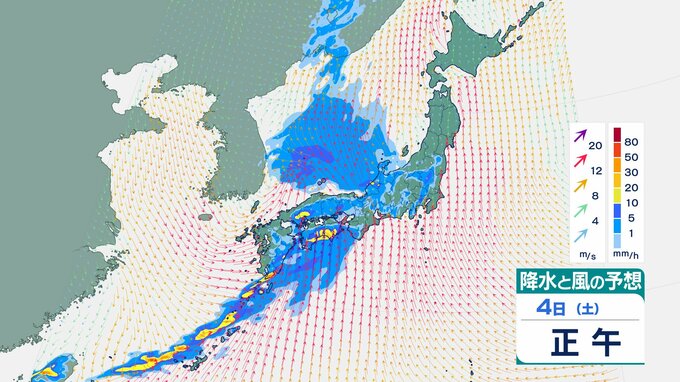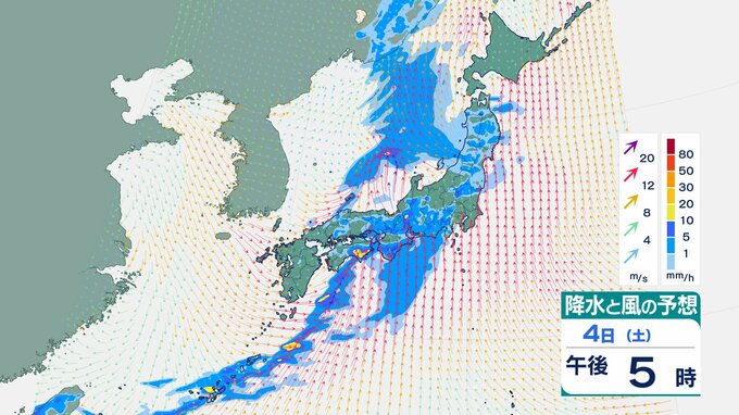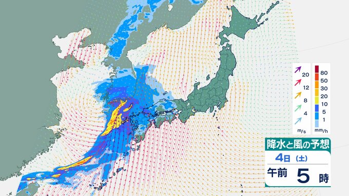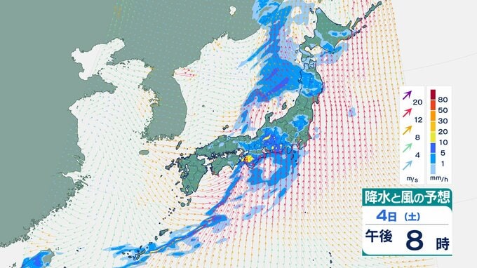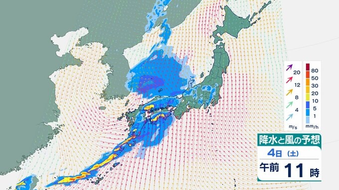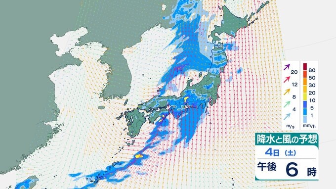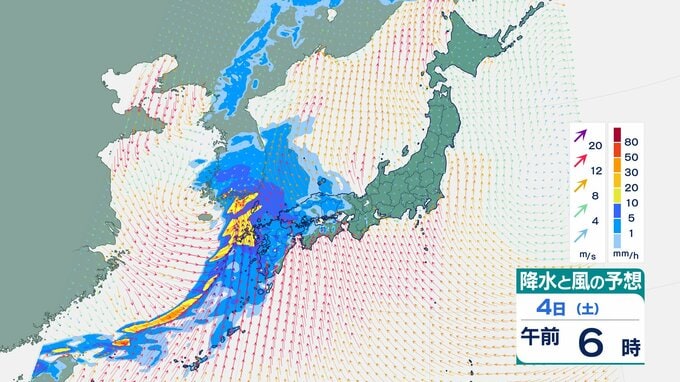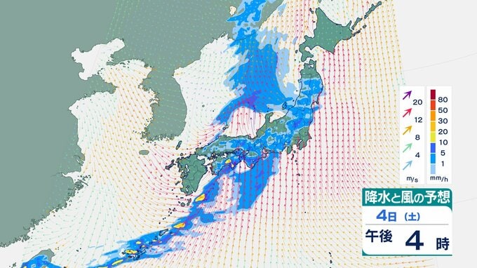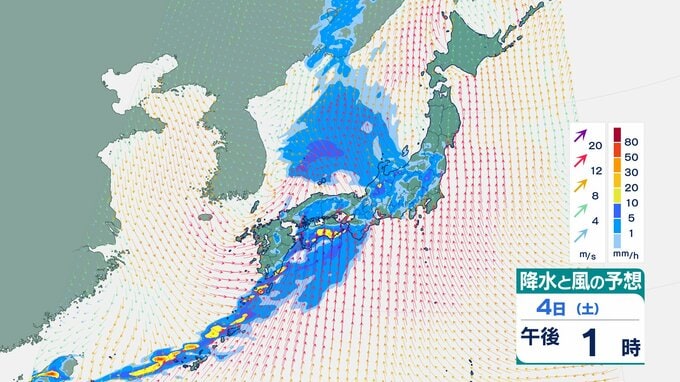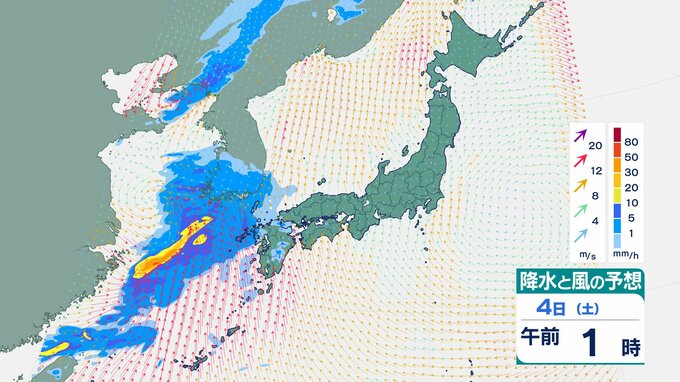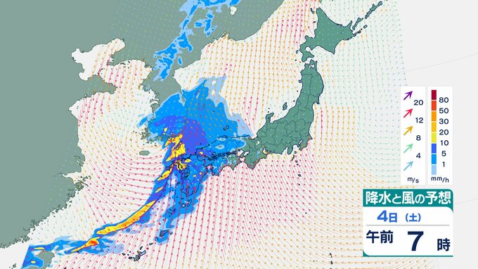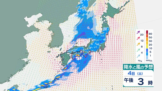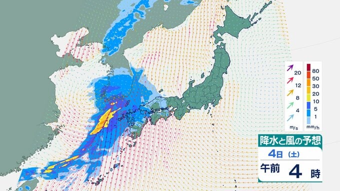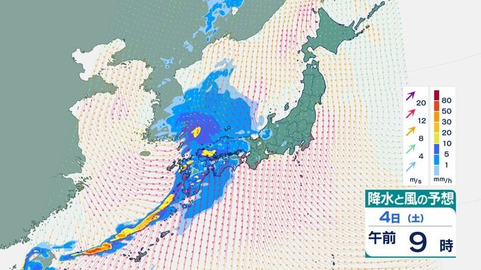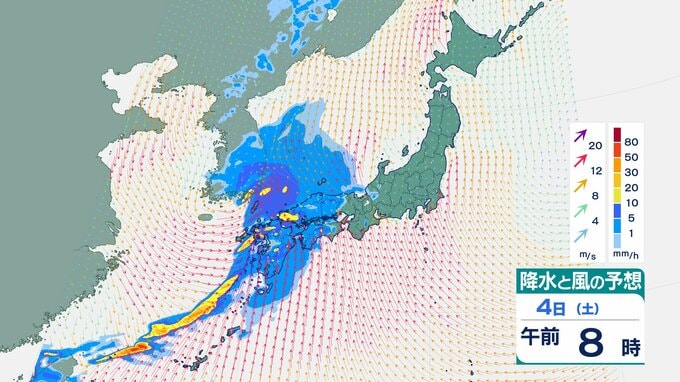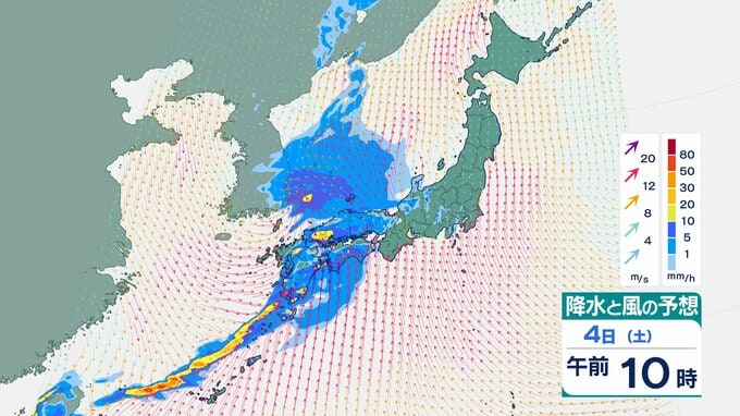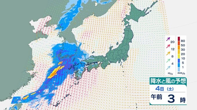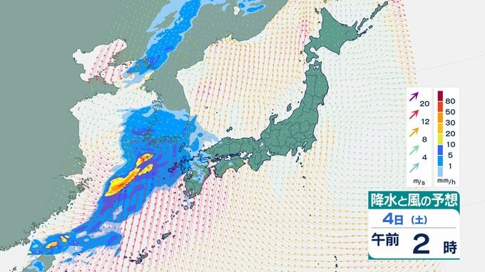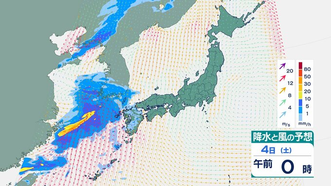 4日の雨と風の予想ですが、低気圧の中心が東シナ海から対馬海峡に向かうのにともなって、未明は九州で、明け方から朝は中国・四国で雨が降り出しそうです。
